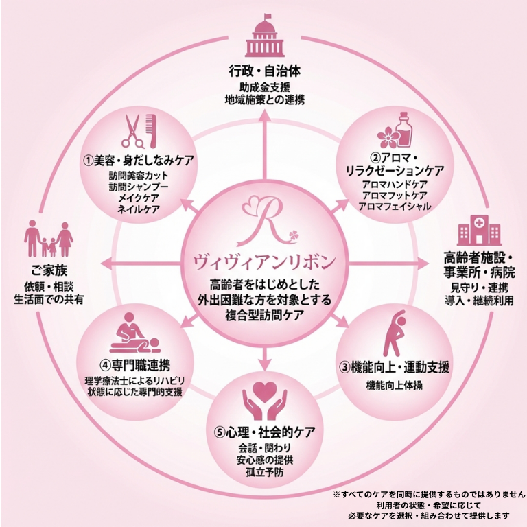 ヴィヴィアンリボンは、35年にわたる美容分野での経験と、医療機関と連携した現場経験を基盤に、福祉の分野において複合型訪問ケア事業を展開しています。